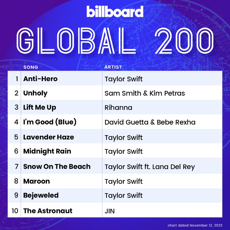 Billboard Global 200 ranks the top songs based on streaming and/or sales activity from more than 200 territories around the world- including the U.S