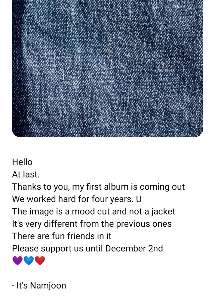 “Hello, Finally. My 1st album will be releasing thanks to everyone. I worked hard on it for the past 4 years.. ㅜ The image is a mood cut, not the jacket cover. It will be very different from my past projects, and a lot of fun friends are gathered in it. Please wish me well until December 2 💜💙❤” RM