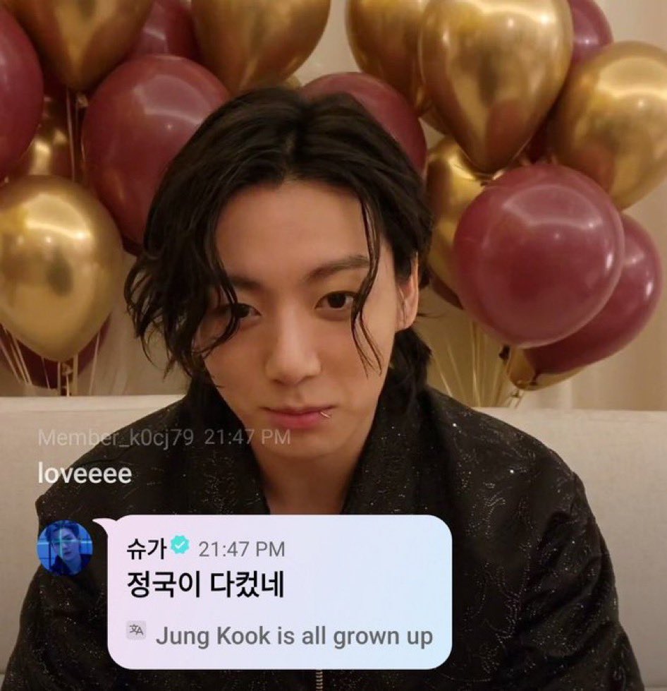 “BTS have watched Jung Kook grow right before their eyes. from the shy 15 year old to the now impressively talented, confident man that he is today. SUGA has always gushed about Jung Kook’s growth and is always impressed by his development. During a variety show SUGA mentioned that Jung Kook was the most talented artist he has ever worked with. Again during their 2022 FESTA dinner he was impressed at how mature Jung Kook had become. He said that Jung Kook had matured and was a grown up. SUGA is like the proud father having watched their child grow up into his own individual. Jung Kook recently had a Live and SUGA commented on is Live, Just as Jungkook was ending his Weverse Live, he wrote,