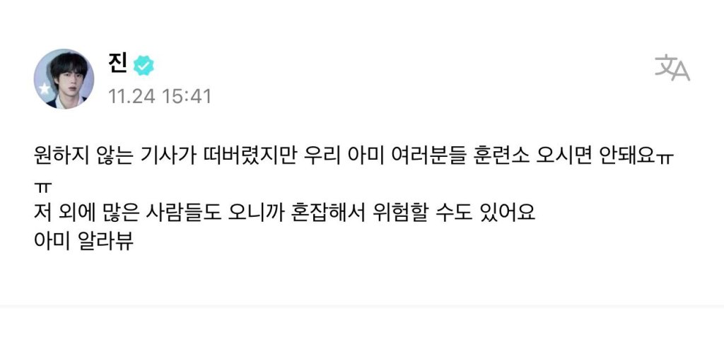 Soon after, Jin took to Weverse to confirm the rumors that had been making the rounds in the media. He said that he would be enlisting in the military in December, almost a week after his birthday, and he urged fans not to visit his training facility because it might be dangerous for them.