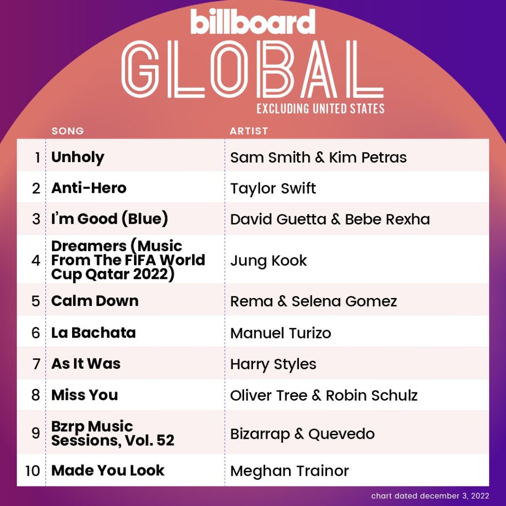 “Dreamers” by Jung Kook debuts inside the Top 10 of Billboard‘s Global 200 and Global Excl. US Charts, at #9 and #4! Jung Kook debuted his solo performance at the FIFA World Cup opening ceremony with the song “Dreamers” that kicked off with setting several record on iTunes and streaming sites. His performance left a lasting impression showing how Jung Kook was destined for the spotlight. This can be added to his illustrious list of legendary live performances.”