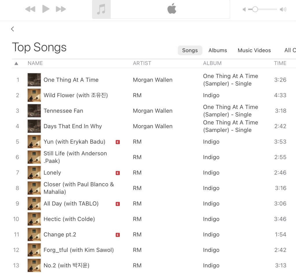 “Wild Flower” becomes RM’s 3rd song to reach #1 on US iTunes, the first two being, Winter Flower (with Younha) and Don’t (with eAeon) All 10 tracks from #Indigo by RM are charting in the Top 13 on US. iTunes !