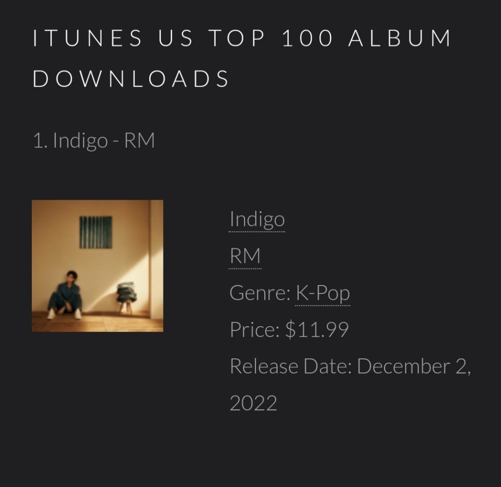 “BTS RM’s Album “Indigo” is now the #1 Pop Album on US iTunes Top 100 Chart. “Indigo” was released on 2nd December 2022. RM has said that with Indigo he created a collaboration that “transcends boundaries” between music and art. The album comprises 10 songs and features appearances by Erykah Badu, Anderson .Paak, and Tablo, among others. The ninth track “Wild Flower”, which features vocals by Youjeen of Cherry Filter, serves as the album’s lead single.