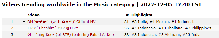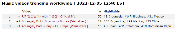 “Wild Flower” by RM and ‘youjeen’s’ music video is still the No.1 Trending Music Video Worldwide & in Music Category for 3rd Consecutive Day. The song released on 2nd December 2022, is till at the top of world wide iTunes. ‘youjeen’ is part of the South Korean rock band Cherry Filter as founded in 1997. Their distinctive music, which can be heard in their most recent two albums and combines trance, punk rock, rave, and emotive ballads, has made them well-known throughout South Korea. Cherry Filter gained notoriety thanks to the song (Nangman Goyang-i, “Romantic Cat”) from the album Made In Korea.