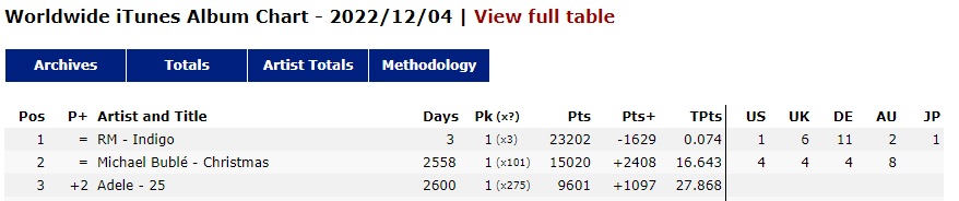 “The world is still loving RM’s just released album, “Indigo” Th album was released on 2nd December 2022 and broke several streaming and iTunes records. The rapper RM’s first studio album, Indigo, is his first full-length release since Mono (2018). The album, which has 10 tracks and cameos from Erykah Badu, Anderson.Paak, Tablo of Epik High, Kim Sa-wol, Paul Blanco, Mahalia, Colde, Youjeen of Cherry Filter, and Park Ji-yoon, is referred to as a chronicle or archive of the latter years of RM’s twenties. The ninth song on the album, “Wild Flower,” which he cowrote with Youjeen is the lead single and music video for the album.