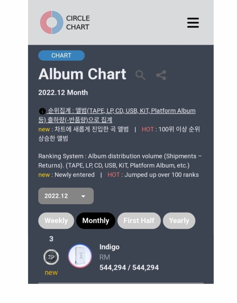 “BTS’ RM receives his 1st KMCA (Korean Music Content Association) Album Certification, an incredible 2x Platinum, on Circle Chart (Gaon) after his album “Indigo” sold over 500K copies. This is the first certificate that RM has. “Indigo” released on 2nd December 2022, marks RM’s first full-length body of work since Mono which he released in 2018. Described as a documentation or archive of the final years of RM’s twenties, the album comprises 10 tracks and features appearances by Erykah Badu, Anderson .Paak, Tablo of Epik High, Kim Sa-wol, Paul Blanco, Mahalia, Colde, Youjeen of Cherry Filter, and Park Ji-yoon.