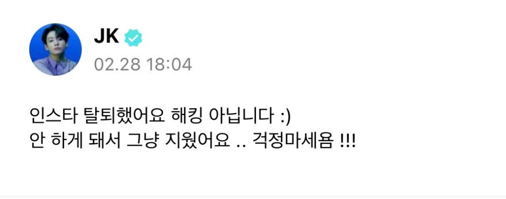 “ive deactivated my instagram, im not hacked :) i ended up not using it so ive just deleted it.. dont worry (aegyo) !!!” Jung Kook