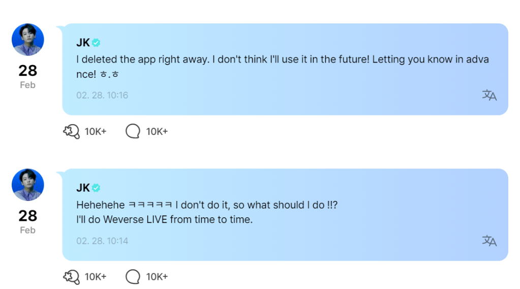 Jungkook has no plans of ever returning to Instagram but promised he will be doing Weverse Live from time to time