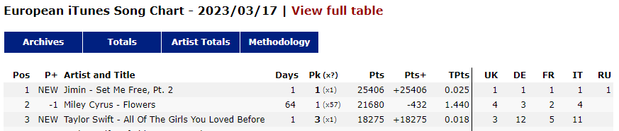 “BTS Jimin’s “Set Me Free” Debuted at #1 on Both European iTunes Song Chart & Worldwide iTunes Song Chart. The song is a pre release track off his upcoming album, “FACE” set to drop on 24th March 2023.