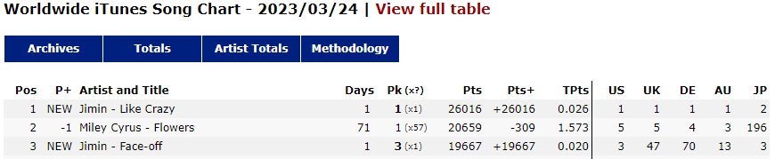 “BTS Jimin’s solo song “Like Crazy” debuts at #1 on both Worldwide & European iTunes Song Chart. The song released on 24th March 2023 hitting the ground running breaking and setting several records on streaming sites.
