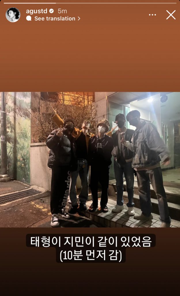 “BTS’ SUGA posted on his isntagram account a photo of the BTS members together, gusss who was with them? Jin! Jin has been serving in the military as part of his mandatory service and repotedly once you spend 100 days in service you are allowed time off with you family. In the picture you can see Jungkook, j-hope, SUGA, Jin, RM. SUGA wrote a caption that said, Jimin and V were there with them but left 10 minutes ago