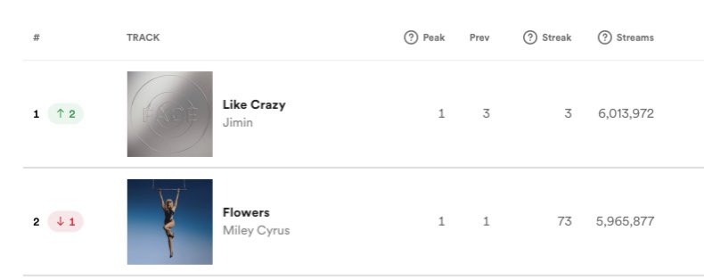 Top 5 songs on the Global Spotify chart #1. Like Crazy — 6.01M (+2) #2. Flowers — 5.96M (-1) #3. TQG — 5.33M (-1) #4. Kill Bill — 5.07M (=) #5. Boy’s a liar Pt.2 — 4.34M (=)