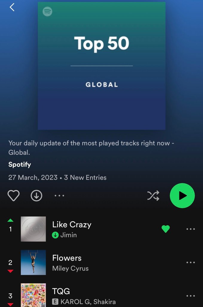 “BTS’ Jimin released his album “FACE” on 24th March 2023 which was accompanied by the title track “Like Crazy” Both the album and the song broke many records and set new once for the artist. On Globla Spotify, Jimin edged out “Flowers” by Miley Cyrus, “TGQ” by KAROL G, Shakira and “Kill Bill” by SZA to be #1 on Global Spotify with 6.01 million streams. Jimin now joined Joji as the only Asian soloists to reach #1 on Spotify Global Chart!