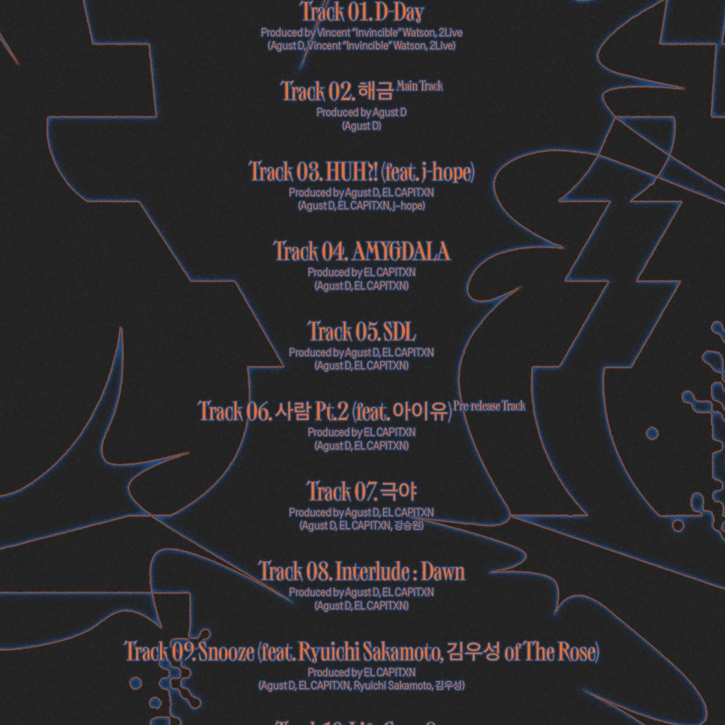 “Agust D has finally rekeased the tracklist for his upcoming album “D-DAY” set to be released on 21st April 2023. The album has 10 sings and has featured several collaborations which include j-hope, Ryuichi Sakamoto, Woosung of The Rose and IU. BTS are on a journey of solo projects as they prepare to serve in the military and so far 4 out of the 7 members have already released their solo projects. j-hope was the frst member to release his album, “Jack In the Box” followed by Jin “The Astronaut”, RM “Indigo” and Jimin’s “FACE” SUGA/Agust D also has a world tour lined up where he will be visiting several countries with tickets sold out withing minutes of being released to the public.