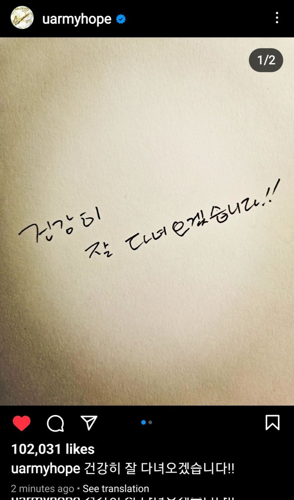 j-hope shared his final selca on Weverse with the sonple words “I love you ARMY, will be back safely“ he finally shaved his hair completely showing his buzz cut.