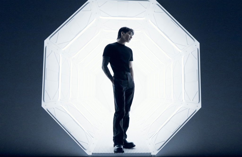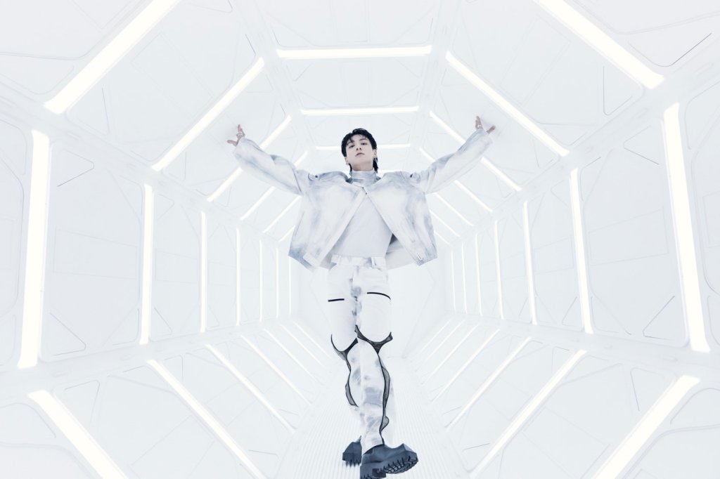 The newly released images featured Jungkook styled in hip-hop-inspired fashion, confidently posing against a sleek white and silver backdrop. The color scheme, modern yet minimalistic, added a futuristic flair that hinted at the genre-bending tone of the song.