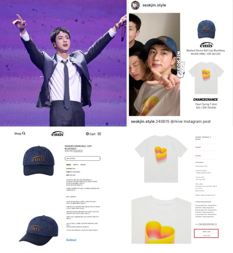 Social media buzzed with excitement as ARMYs across the globe worked to identify the exact items Jin was wearing. With the collective strength of the fanbase, it didn’t take long for fans to pinpoint the brands. The T-shirt, known for its sleek and minimalist design, and the cap, a trendy and understated accessory, quickly became the most coveted items online. As soon as these items were restocked, fans rushed to purchase them. However, within seconds, the products were completely sold out, leaving many ARMYs disappointed but further cementing Jin’s reputation as the “Sold-Out King.”