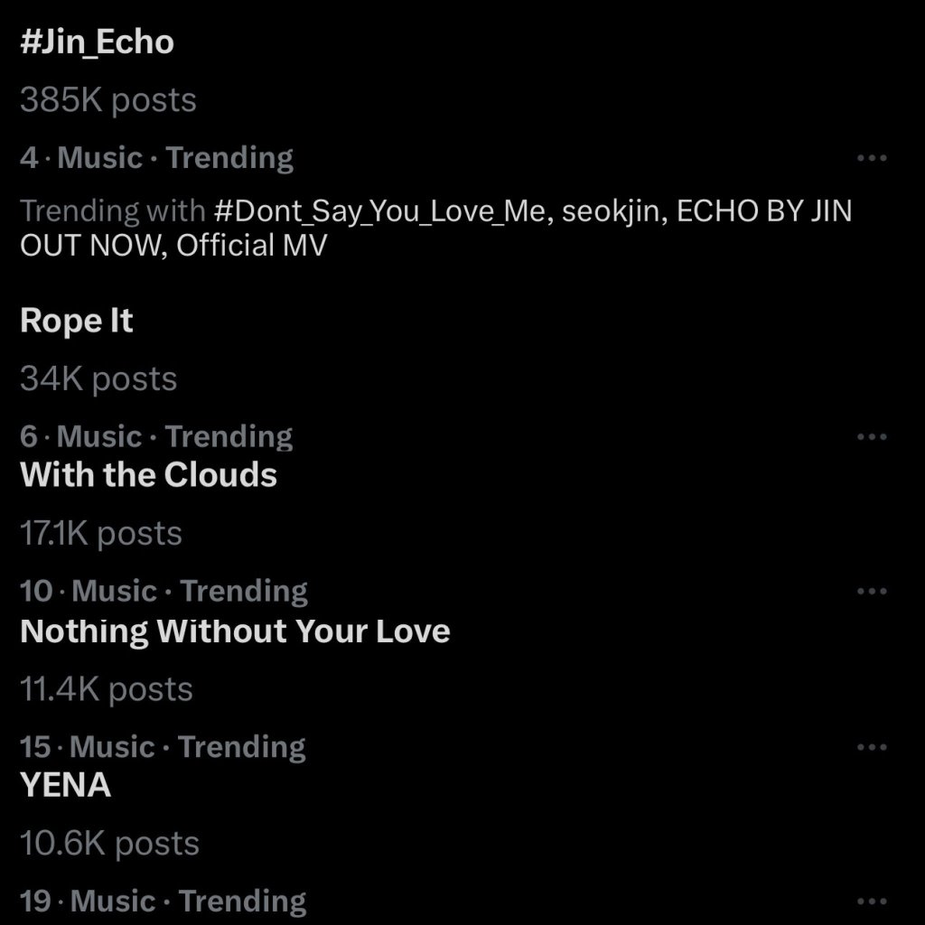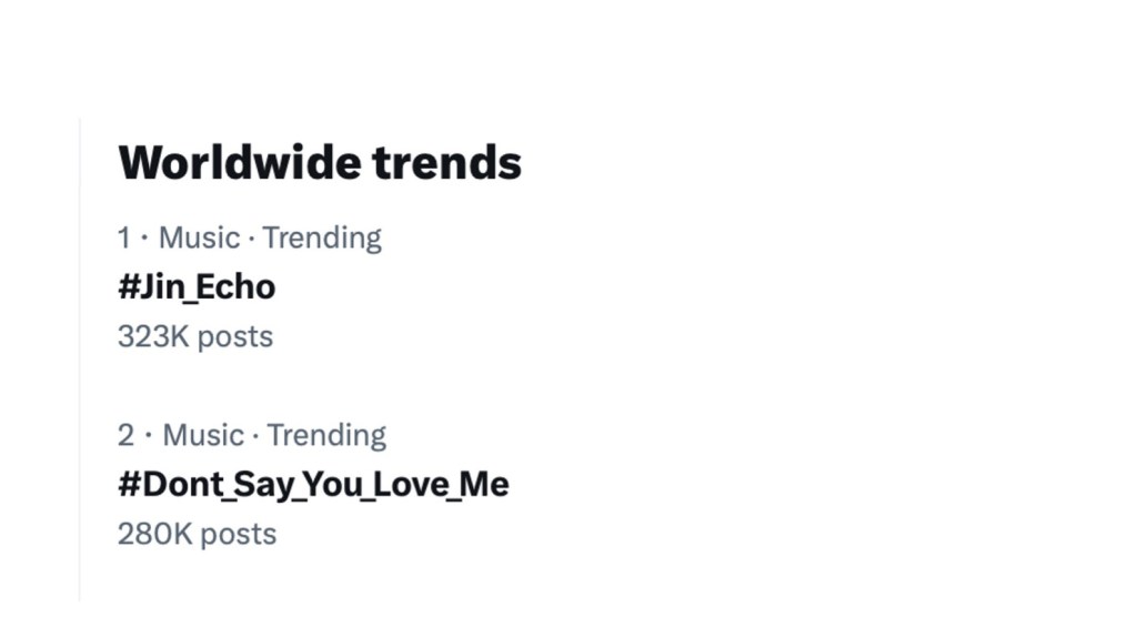 BTS’s Jin has once again demonstrated his immense global influence, capturing the top two worldwide trending spots on X (formerly Twitter) following the release of his new single “Don’t Say You Love Me” and his second solo EP, ECHO. The hashtags #Jin_Echo and #Dont_Say_You_Love_Me dominated the platform, reflecting the overwhelming excitement and support from fans worldwide. Jin is currently trending at #4, #6, #10, #15 and #19