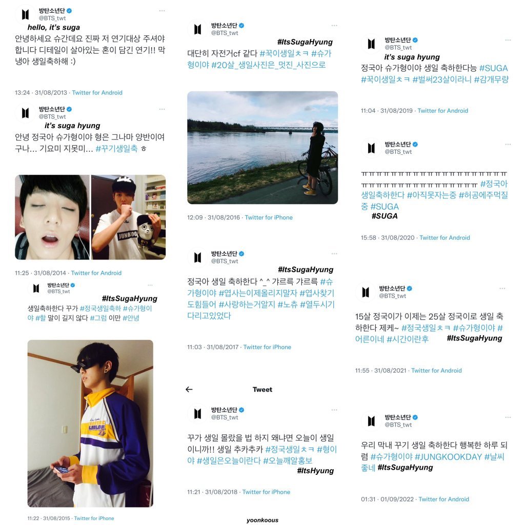 Back in 2024, someone even made a compilation of SUGA’s #ItsSUGAHyung birthday tweets for Jimin from 2013 -2022.