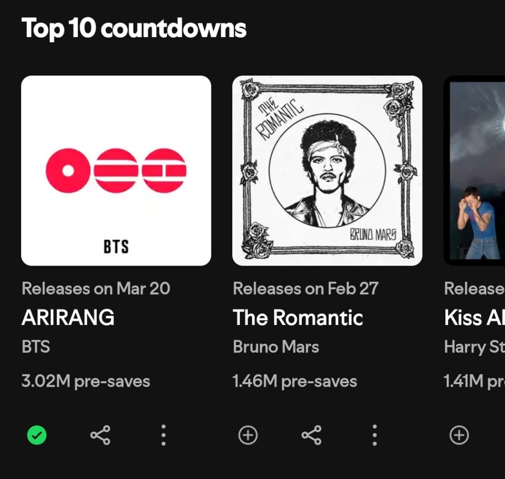 BTS are once again rewriting the rules of global music anticipation. Their fifth studio album, ARIRANG, has officially surpassed 3.09 million pre-saves on Spotify, making it the most pre-saved upcoming album on the platform and placing it firmly at the top of Spotify’s Global Countdown. The milestone puts BTS ahead of major international artists, underscoring the group’s unmatched digital power even before the album’s release.